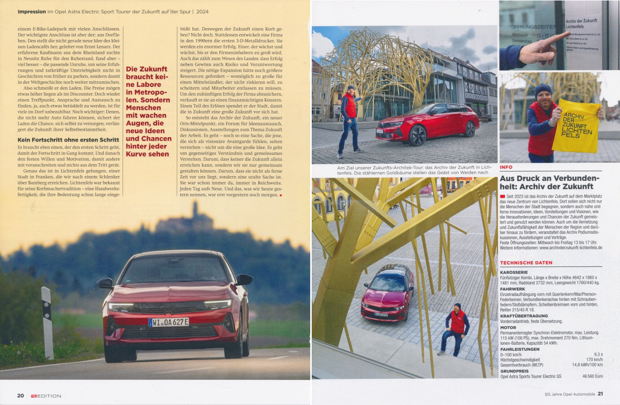Mit dem Opel Astra Electric Sports Tourer auf dem Weg in die Zukunft. Dabei kommt man zwangsläufig am Archiv der Zukunft in Lichtenfels vorbei. Ein toller Bericht von Sebastian Renz (Text) und Hans-Dieter Seufert (Fotos).