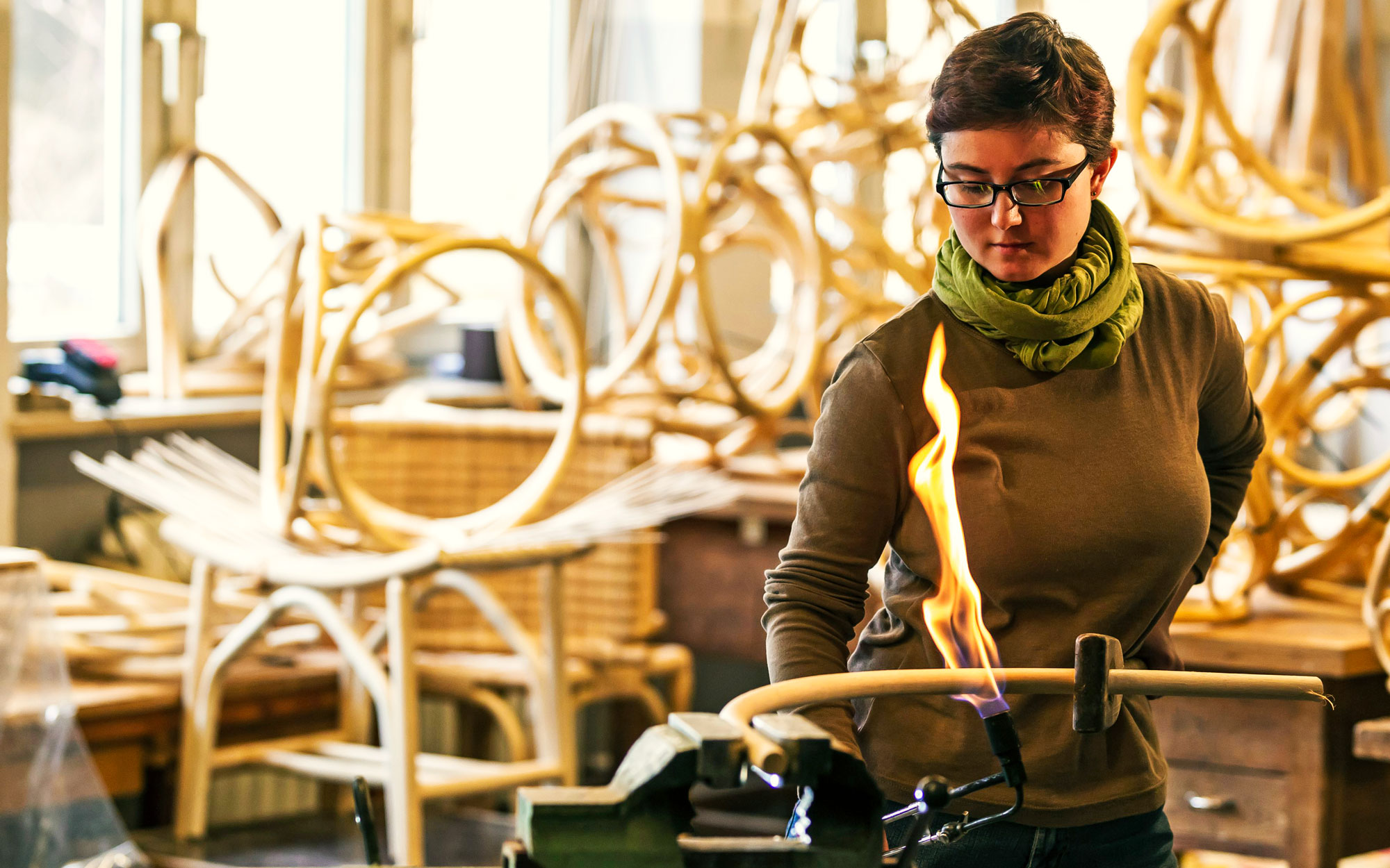 Das Archiv der Zukunft greift das Thema Weide auf und zeigt auf beeindruckende Weise das Wachsen des natürlichen Rohstoffes unseres Handwerks. Im Rahmen eines Projekts im Fach „Gestaltung“ an der Fachschule hat sich die 11. Klasse mit Sitzmöbeln aus Weide auseinandergesetzt und für den Showroom zwei ausgewählte Entwürfe realisiert.