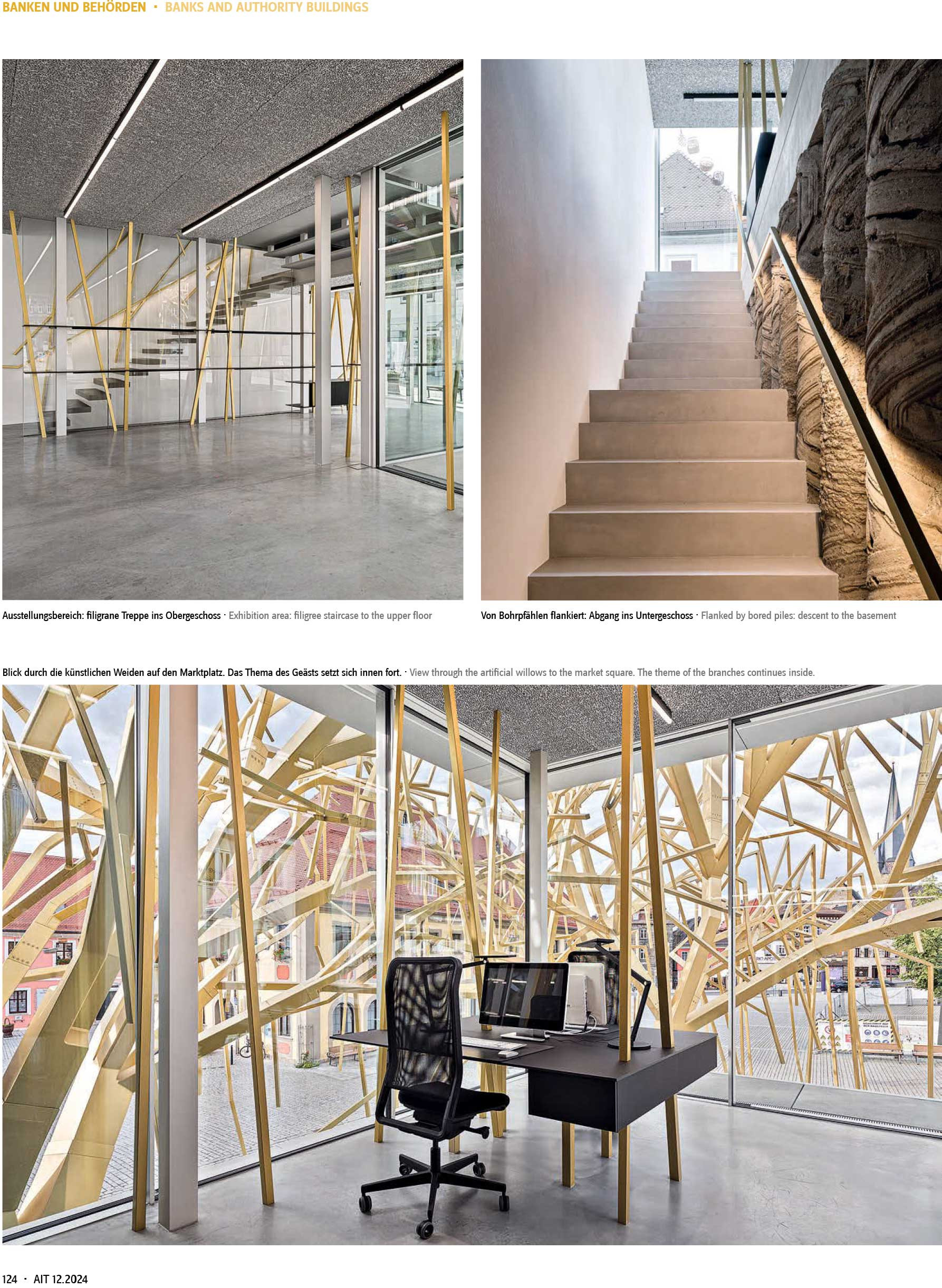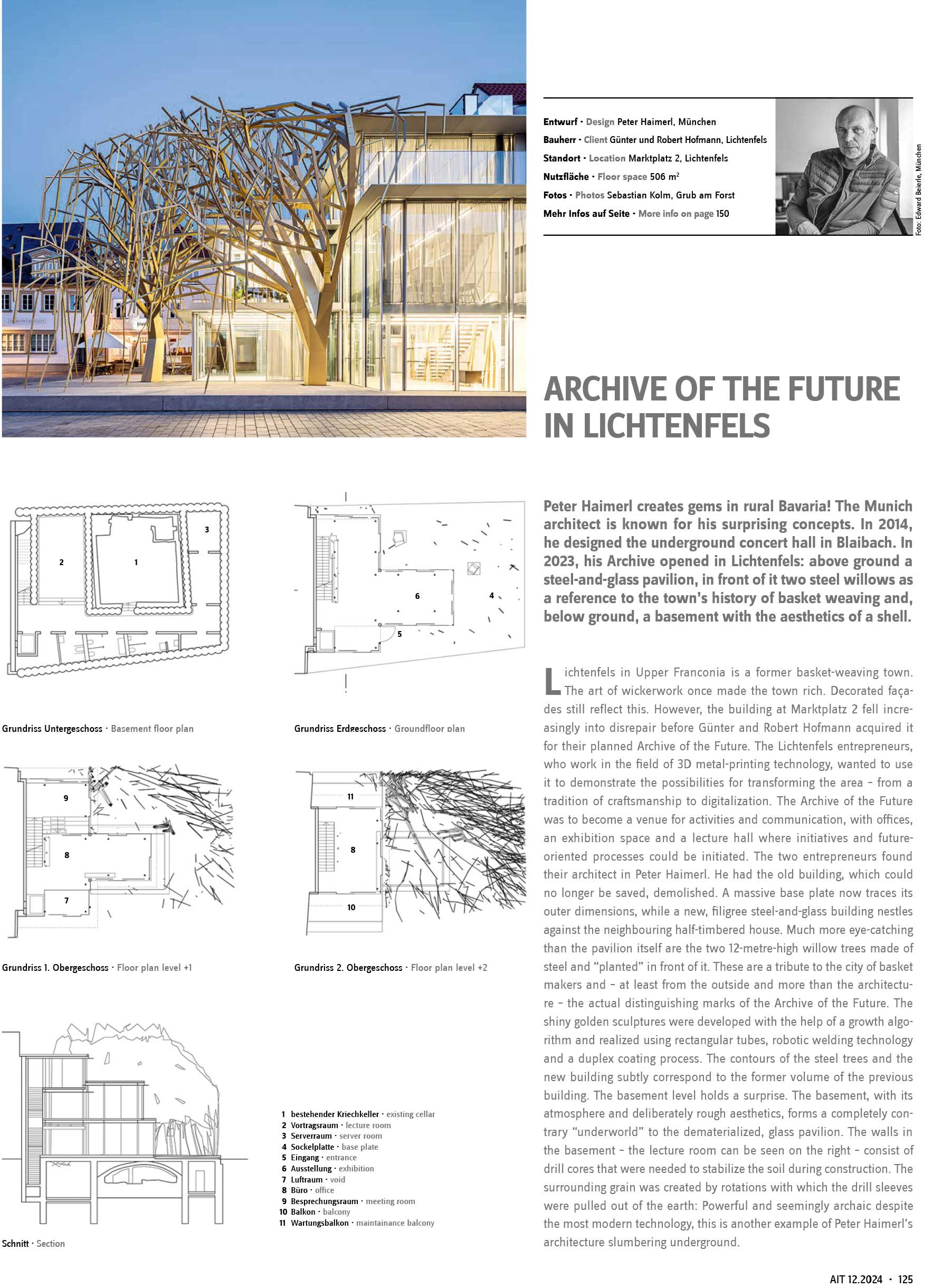 Peter Haimerl schafft Provinzperlen! Der Münchner Architekt ist für seine überraschenden Konzepte im ländlichen bayrischen Raum bekannt. 2014 - ja, schon zehn Jahre ist es her! - realisierte er das viel beachtete unterirdische Konzerthaus in Blaibach. 2023 eröffnete er in Lichtenfels sein Archiv der Zukunft: oberirdisch ein Stahl-Glas-Pavillon, davor zwei Weiden aus Stahl als Referenz an die Korbmacherstadt, unterirdisch ein wiederbelebter Keller in Rohbau-Ästhetik. Hier der ganze Artikel: